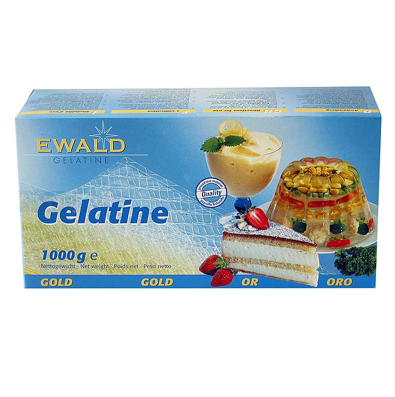 Gelatina este incoloră, inodora și fără gust, obtinuta din sorici de porc. Ideala pentru creme, mousse, terine, jeleuri dar si aperitive, aspicuri. Aplicare: Înmuiați câteva frunze în apă rece timp de aproximativ 5 minute, stoarceți ușor. Pentru mâncăruri reci (inclusiv smântână), dizolvați gelatina în puțină apă fierbinte sau alcool, apoi amestecați treptat masa rece în gelatină - vă rog niciodată invers!