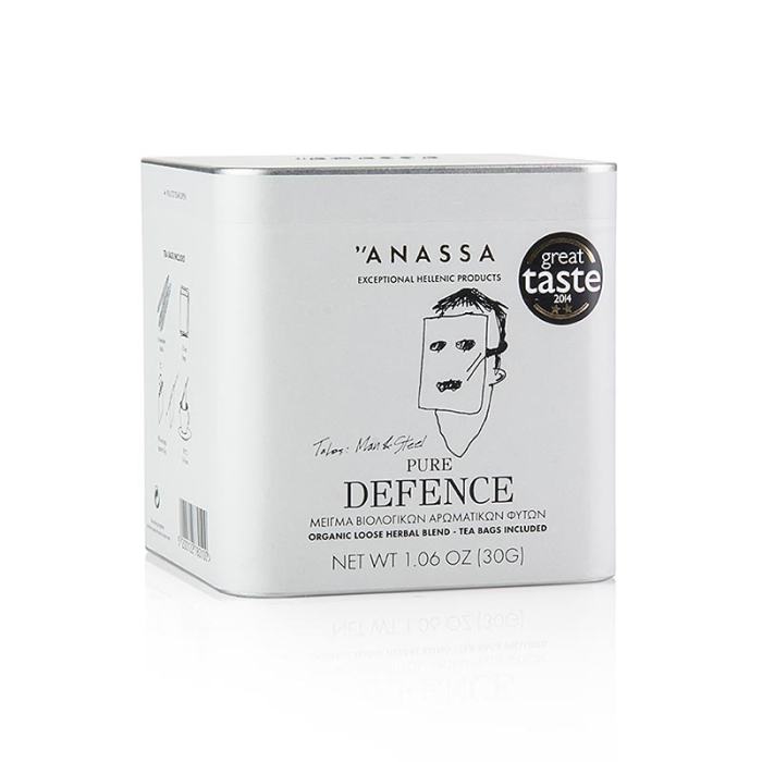 Ceai din plante organic „Pure Defence”, vrac, cu pliculete de ceai. Ingrediente: ceai grecesc de munte*, dictam*, macese*, buburuza*. *Din culturi organice controlate. Timp de infuzare: 5-8 minute in apa clocotita. A se pastra intr-un loc racoros si uscat. Agricultura UE.