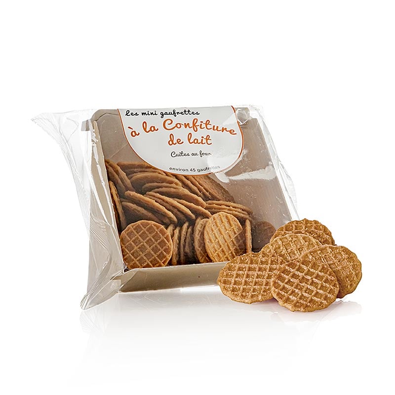 Mini vafe frantuzesti cu dulce de leche. Ingrediente: FAINA DE GRAU, gem de lapte 21,5% (LAPTE, zahar, LAPTE PRB degresat, arome naturale), zahar, ulei de floarea soarelui, arome naturale, FIBRE DE GRAU, emulgator: lecitina de rapita, sare Guérande, praf de copt (tartrat de potasiu, carbonat de sodiu) . A se pastra intr-un loc racoros si uscat.
