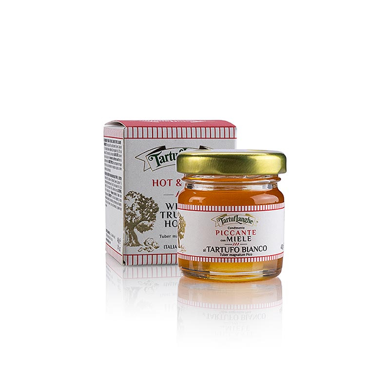 Tartuflanghe Condiment iute cu miere si trufa alba. Ingrediente: Miere de salcam 98%, extracte de ardei iute (Cayenne, Capsicum) 1%, trufa alba italiana liofilizata (Tuber magnatum Pico) 0,05% (echivalent cu 0,3% trufa proaspata), aroma naturala. Sfat de servire: Este ideal ca acompaniament la branzeturile tari si cu mucegai albastru. Un condiment ideal pentru prepararea vinegretei. Este ideal pentru glazurarea sau marinarea carnii de porc, rata si pui. A se pastra intr-un loc racoros si uscat. Proprietati: fara gluten.